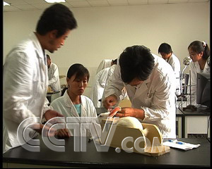 這邊是老師在用豬做實(shí)驗(yàn),在另一間教室里,蘇州大學(xué)生命科學(xué)學(xué)院的學(xué)生們實(shí)驗(yàn)課也剛剛開始,不過他們的實(shí)驗(yàn)對(duì)象不是豬,而是兔子,用兔子耳朵練習(xí)靜脈注射。對(duì)醫(yī)學(xué)專業(yè)的大學(xué)生來說,兔子最他們大學(xué)生活最熟悉的實(shí)驗(yàn)動(dòng)物。
