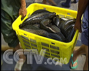 黑魚經(jīng)銷商 高根其:“用網(wǎng)打的魚容易受傷,毛掉的上市后不好賣,這樣抓光滑點,不會受傷。”